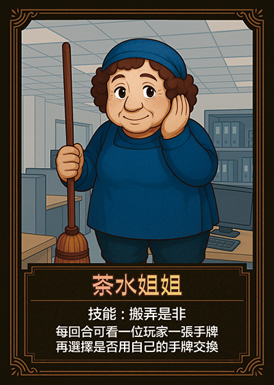 辦公室茶水間女王,手持熱水壺如權杖,一杯奶茶換八卦情報,笑裡藏刀,人人欠她一杯!