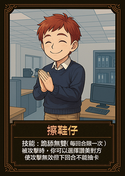 老闆鞋底灰他先舔,馬屁精通十八式,茶倒膝跪樣樣行,升職加薪全靠這張嘴和彎腰!